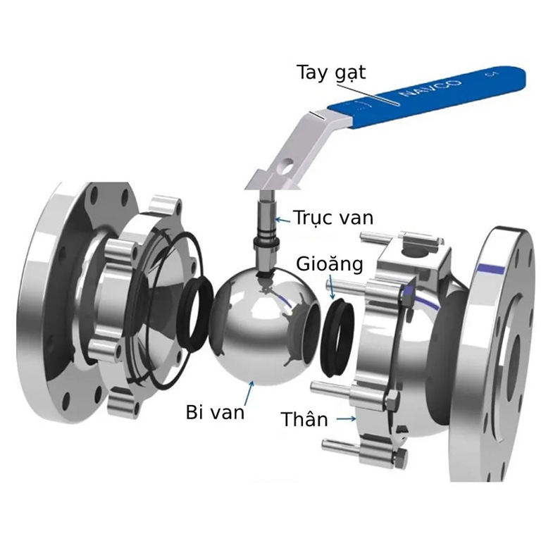 Cấu tạo gồm bi inox có lỗ rỗng bên trong, xoay 90° để đóng/mở dòng chảy. Ưu điểm: thao tác nhanh, độ kín cao, phù hợp với hệ thống nước sạch, khí nén, dầu khí. -